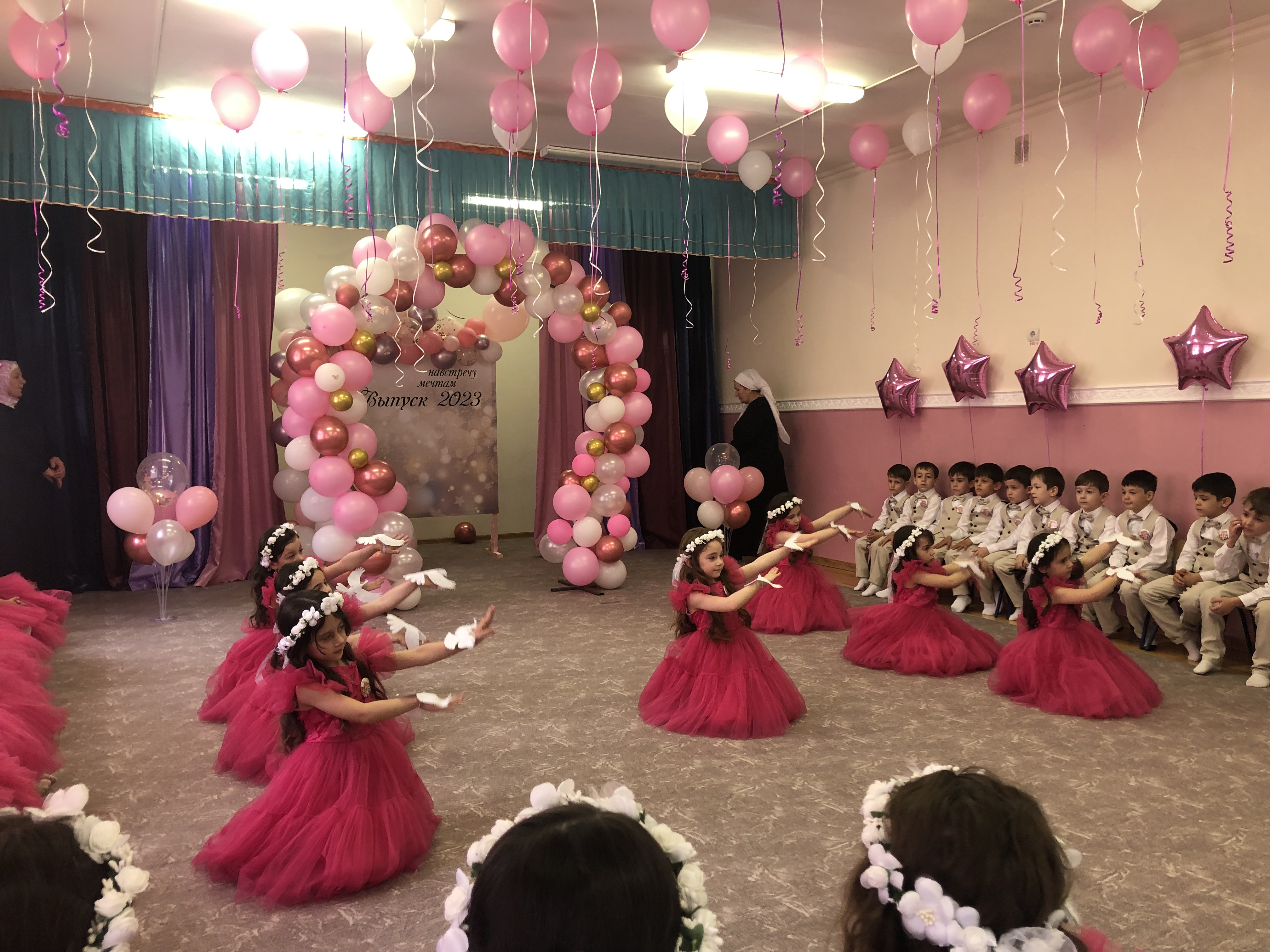 26.05.2023В 2023 г. в нашем саду выпускались 2 группы: «Гномики» и «Смешарики» Оформление зала, одежда детей и воспитателей были в одном тоне, так «Гномики» были в розовом тоне, а «Смешарики» были в сером тоне. У обеих групп двойная арка из шаров, розовые арки у «Гномиков», и серые арки у «Смешариков» Обе группы показали красочное представление, танцы, песни, стихи, а у «Смешариков» 2 сценки, которые уморили всех присутствующих. Папа ищет сына в детском саду, под конец папа понимает, что его сын в школе, а вторая сценка «Наш сын получил двойку»